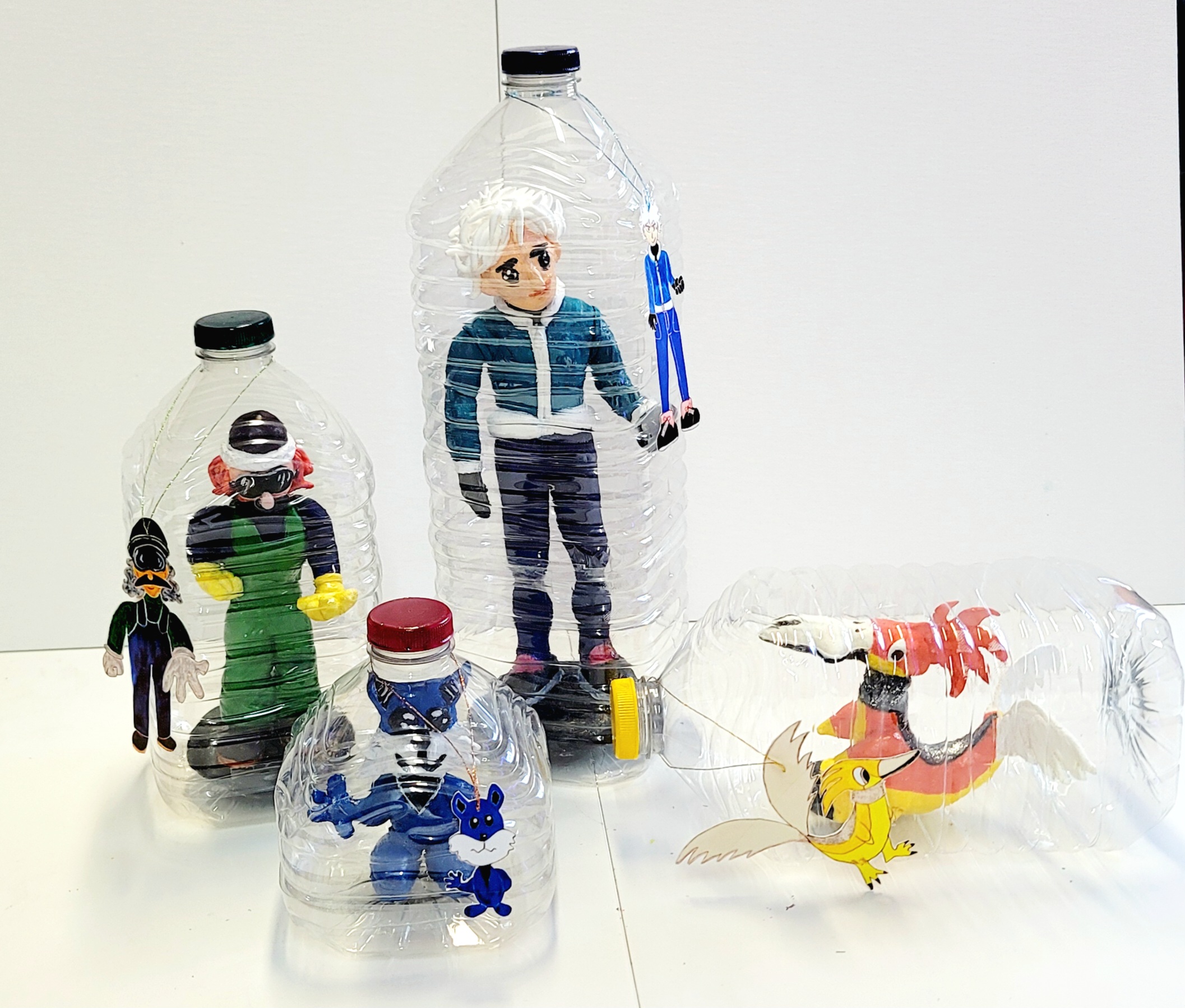 These four sculptures are made with clay and acrylic paint, each representing my original characters. While they all have similar looks to one another, they all contrast in terms of color. Clay and acrylic paint were used to explore a different outlet for artistic expression. These characters were designed to show my interest in animals, fantasy, and action.