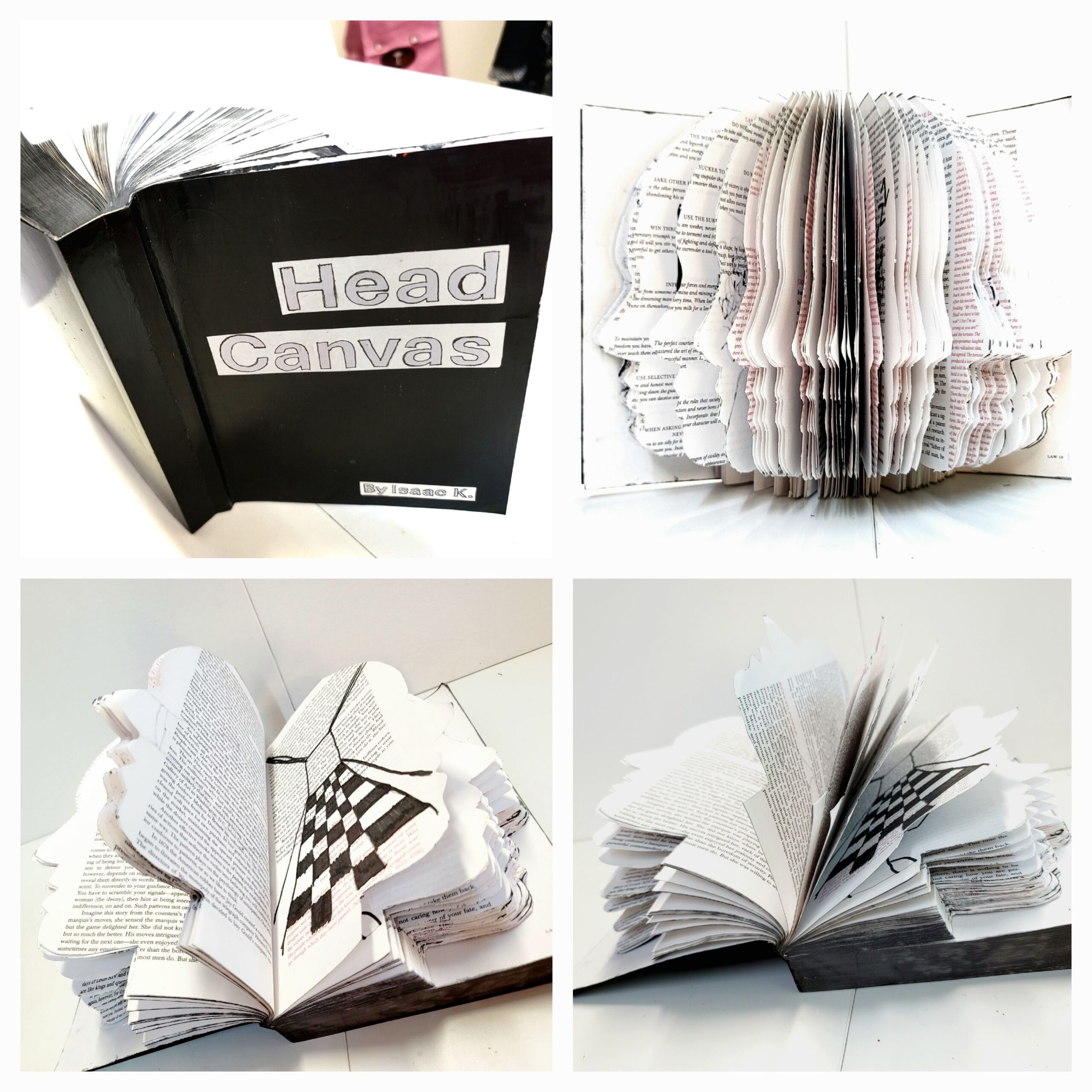 This modified book showcases the physical representations of our thoughts. The reason that the covers are black-painted is because this shows the lack of thoughts and emptiness. Each page represents an image, signifying the complexity of thoughts, emotions, and perspectives within a person.